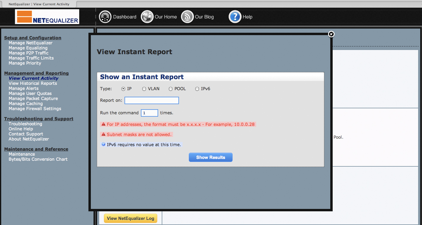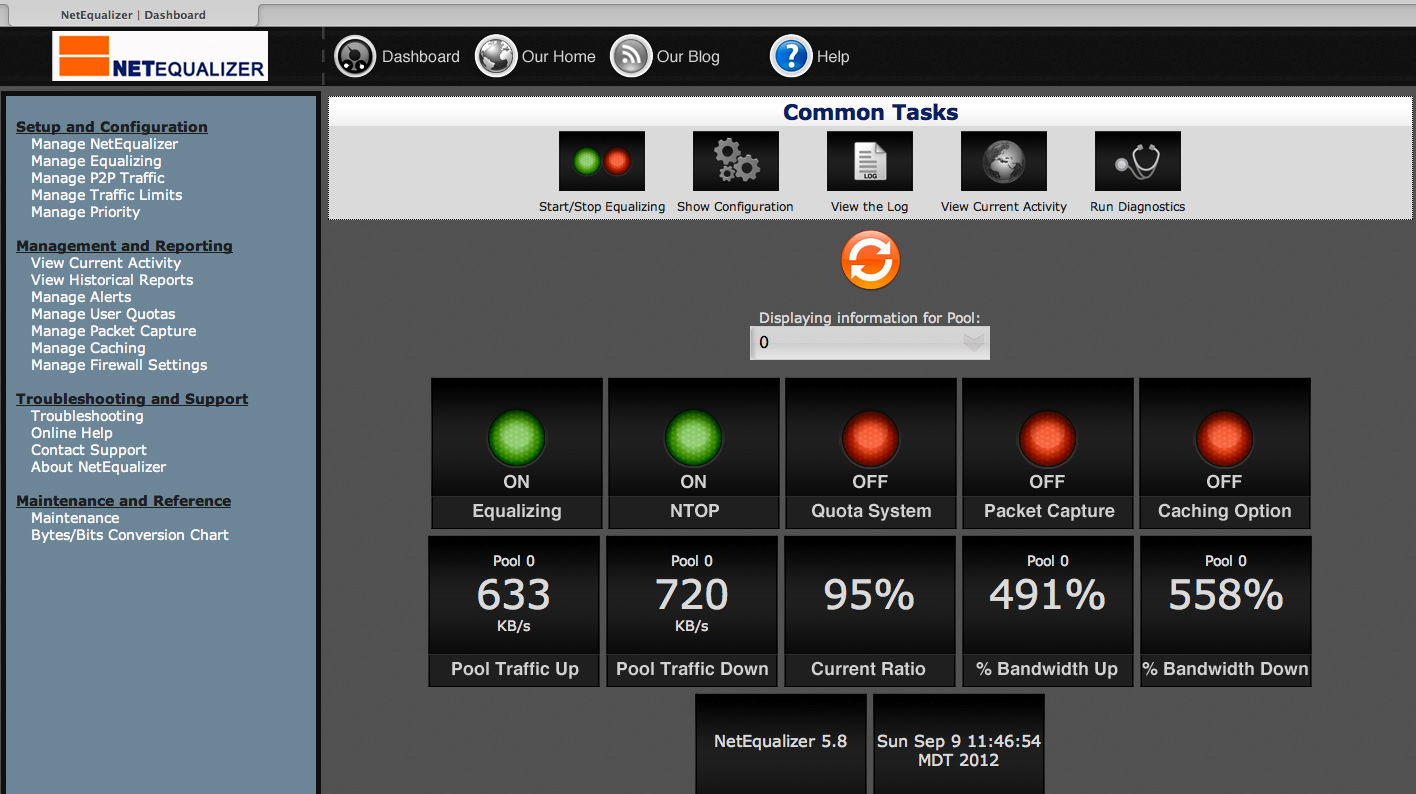 New NetEqualizer GUI The new GUI is part of the 6.0 Software Update, and includes the same functionality that you already know, with enhancements in the following areas: New Dashboard Feature Our new Dashboard provides an intuitive visual display of the status on critical data and settings within NetEqualizer. The Dashboard contains on/off statuses for Equalizing, ntop, Packet Capture, Quotas, and Caching, so that you can quickly tell if your key functions are running. It also contains statistics about traffic running through your NetEqualizer. Menus Aligned by Key Functions We have redesigned our menus to better support your workflow. For example, if you are setting up and configuring your unit, all key functions related to this are now in the “Setup and Configuration” Menu section. Other key menus are Management and Reporting, Troubleshooting and Support, and Maintenance and Reference. Consistent Look and Feel We’ve enhanced our look and feel by modernizing the interface and improving error messages, buttons, and colors. Professional Quota API The Professional Quota API functionality introduced in 5.8 has been incorporated into our 6.0 GUI. The Professional Quota API helps you to quickly and easily utilize our NetEqualizer User-Quota API toolset commands via a GUI interface. Please email us if you would like to be part of our Beta Test! Tests will run throughout September, with our GA release sometime in October. To view a live demo NetEqualizer, with the new GUI installed, click here to register (because of security reasons, we can’t give the password to the live demo machine here). As always, the 6.0 Software Update will be available at no charge to customers with valid NetEqualizer Software Subscriptions (NSS). For more information on the NetEqualizer or the upcoming release, visit our blog or contact us at: -or-