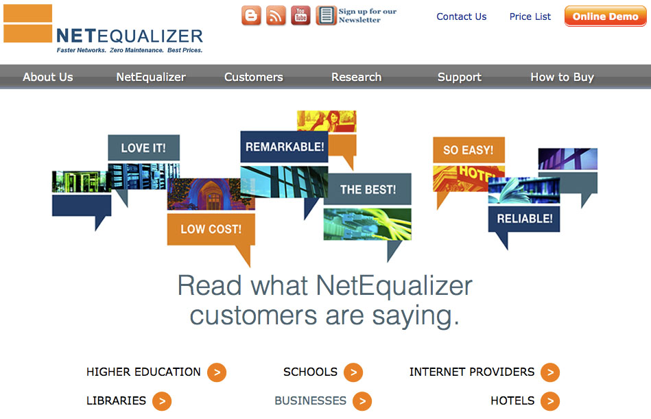 We are looking for a host for our next seminar! Possible locations are not limited to the United States and anyone across the world willing to have this half day event should not hesitate to contact us! The seminar brings our CTO, Art Reisman, directly to you. In this presentation, Art explores the NetEqualizer technology in detail, and answers your technical questions. So, whether you are an existing customer or just starting to think about bandwidth shaping, come learn more about the NetEqualizer technology and share your experiences with other customers. Remember – this is not a marketing presentation; it was created by techies, for techies! Our Fall Release is almost ready and we’ve selected the final features that will be implemented in the release. They are: * Show All Rules for an IP – easily see which rules apply to a given IP for quick troubleshooting and reporting. * Network Load Graph – a simplified version of the ntop load graph so you can see bandwidth usage over time. * NSLookup Capability – do an NSLookup of any IP address in your active connections. If your organization uses dynamic DNS, this is the feature for you. Each feature helps enhance our Dynamic Real-Time Reporting tool (RTR) and we are excited to continue improving this interface. We’d love to hear your ideas on what else could be included (either new features for the GUI or ntop features you’d like to see incorporated into our reporting tool). Our last feature listed (NSLookup Capability) was a request by NetEqualizer customer James Watson – Director of Technology Services at Spring Independent School District. Thanks James! This summer we asked for your input on new features and we received a lot of great ideas. We’d like to thank all of the people who sent us suggestions. We’ll certainly keep those around and try to incorporate them into future releases! Our Fall Release will be free to customers with valid NetEqualizer Software and Support who are running 7.0+. If you are not current with NSS, contact us today! 10 Year Anniversary Charitable Giving Summary! Throughout the summer we were celebrating our 10 year anniversary by donating a portion of all NetEqualizer sales to a charity of the customer’s choice. We ended up giving away substantial donations to the following charities: 4) UNICEF Thanks to all of our new and existing customers who helped make this a great summer of giving! Coming Soon: New Website Design! We have been working with a graphic designer the last couple months to make our website easier to read and use. We’ve already updated our Customers page – here is a screenshot: Next up – a new main page which will include our new look and feel. We will roll out the changes this fall with an updated site to be live by January 2014. Look for that in an upcoming newsletter! In July we announced our new NetEqualizer Leasing Program, and since it went live we have seen a great adoption rate. We are getting feedback that the program is working well for folks that need to align monthly expenditures with a monthly revenue steam – models commonly used by Business Centers and Internet Service Providers (for example). If you are a business owner in either of these verticals, you should check out our Leasing Program to see if it meets your needs. If was not for the Linux community, and all the early adopters who trialed our very early NetEqualizer (raw versions) – numbering 10’s of thousands – there would likely be no NetEqualizer alternative in the traffic shaping space. The cost structure to market a boot-strapped company would otherwise require VC money and our price points would be 3 to 4 times as much to recoup their investments. ![]() The Clue Denver group is one of the most active Linux user groups in the country and we have recently been scheduled to speak at one of their upcoming meetings! We can’t wait to go back and speak to them and get some of their ideas on future products! Check out their meeting calendar and if you are in the Denver, CO area, stop on by! Who is Your Customer?